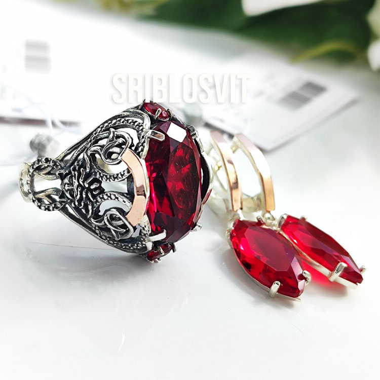 Срібні прикраси з гранатом, Жіночий срібний комплект з гранатом (каблучка + сережки) – магічний блиск гранату